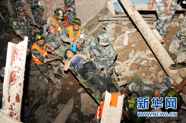 8月8日20時(shí)50分左右,蘭州軍區某防化團官兵救出一名幸存者。甘肅舟曲縣特大山洪泥石流災害發(fā)生后,蘭州軍區某防化團602名官兵經(jīng)過(guò)6個(gè)多小時(shí)的急行軍到達災區,隨即展開(kāi)人員搜救,截至8日20時(shí)50分共救出9名幸存者。目前,官兵們仍連夜奮戰在救援一線(xiàn),爭分奪秒進(jìn)行生命大營(yíng)救。新華社發(fā) (張永進(jìn) 攝)