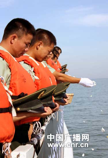 “脫帽!向甘肅舟曲特大山洪泥石流遇難同胞默哀!”隨著(zhù)指揮員的一聲令下,汽笛劃破長(cháng)空,國旗徐徐下降,官兵在巡邏艇上莊嚴肅立,脫帽默哀3分鐘,沉重的警報聲在天空久久回蕩,訴說(shuō)著(zhù)海警官兵對甘肅舟曲特大山洪泥石流遇難同胞的無(wú)盡哀思。隨后,官兵們在海上將一片片花瓣灑向大海,美麗的花瓣隨著(zhù)浪花漂進(jìn)無(wú)盡的大海,寄托著(zhù)海警官兵對遇難同胞的無(wú)限思念,為災區人民默默祈福。