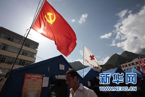 8月19日,在舟曲縣一個(gè)災民安置點(diǎn),一面黨旗迎風(fēng)飄揚。新華社記者 任正來(lái) 攝