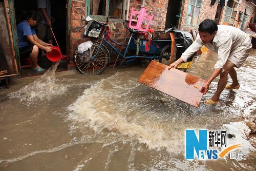 6月15日,在南寧市廣西醫科大學(xué)第二附屬醫院附近的居民區,居民在屋前排水。新華社發(fā)(唐輝吉 攝)
