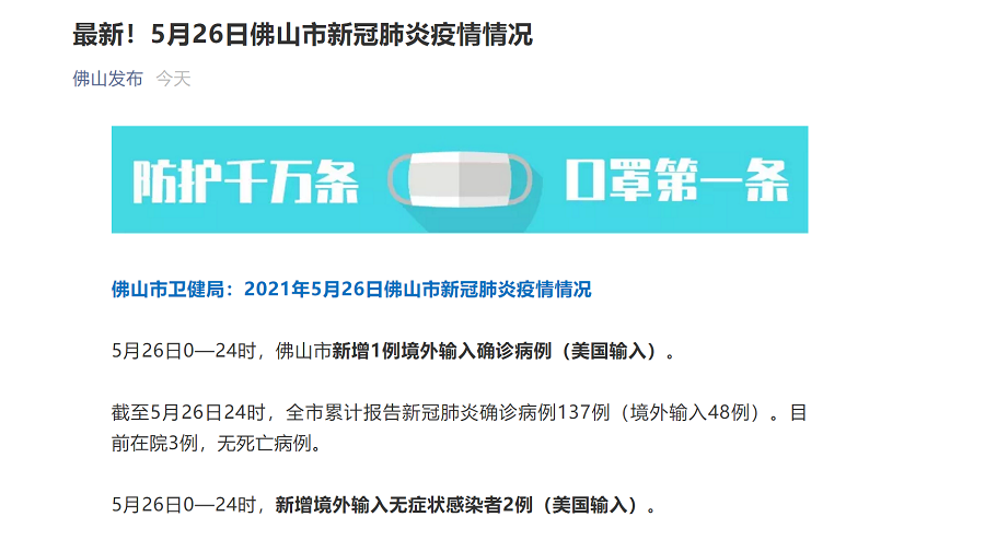 央廣網(wǎng)佛山5月27日消息(記者 周羽 鄭澍)5月27日,據佛山市衛健局消息,5月26日0—24時(shí),佛山市新增1例境外輸入確診病例(美國輸入)。
