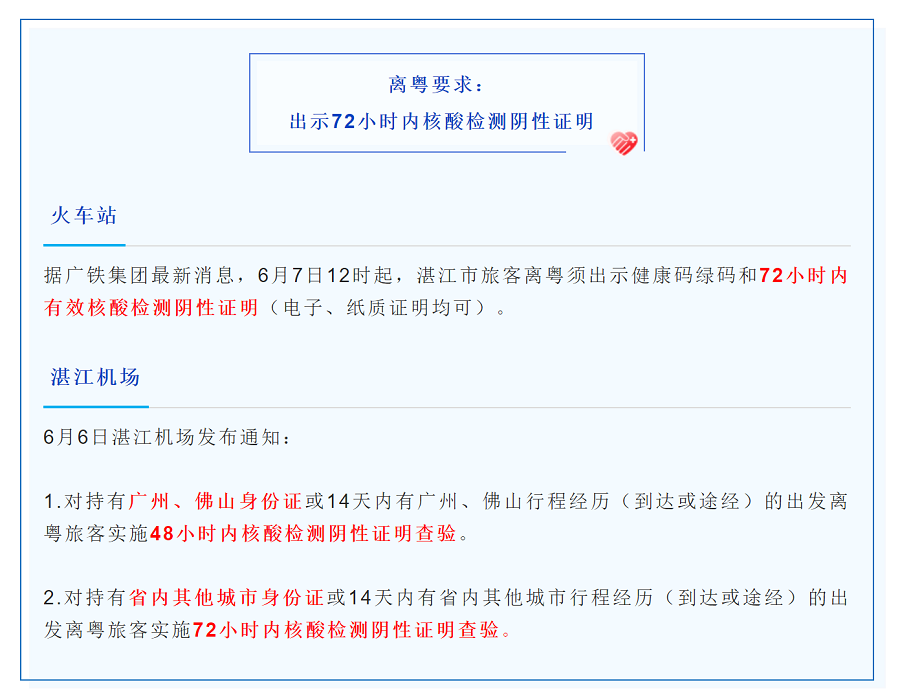 湛江人離粵 需出示72小時(shí)內核酸檢測陰性證明