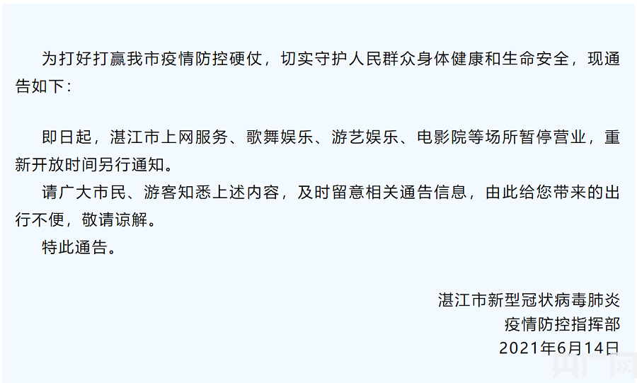 6月14日起,湛江市上網(wǎng)服務(wù)、歌舞娛樂(lè )、游藝娛樂(lè )、電影院等場(chǎng)所暫停營(yíng)業(yè),重新開(kāi)放時(shí)間另行通知。