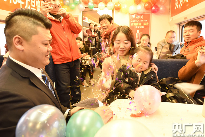 “平川雁陣映殘陽(yáng),謎底是春字!”來(lái)自孝感的乘客張女士高興地參與了扎氣球猜字謎的游戲,在大家的歡呼聲中,她扎開(kāi)了一個(gè)寓意“元旦快樂(lè )”的氣球,答出了謎底,贏(yíng)得了動(dòng)姐送上的一份精美禮品,樂(lè )的合不攏嘴。