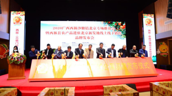 當日,推介會(huì )上商賈云集,賓朋滿(mǎn)座,大家一起品桔子,敘友情,謀發(fā)展,求共贏(yíng)!2020年西林沙糖桔推介活動(dòng)”正式啟動(dòng),將活動(dòng)氛圍推向高潮;顒(dòng)中舉行了西林沙糖桔區域公用品牌揭牌儀式。西林縣與北京新發(fā)地農產(chǎn)品發(fā)批市場(chǎng)簽署戰略合作協(xié)議,西林企業(yè)、電商代表與銷(xiāo)售流通企業(yè)進(jìn)行產(chǎn)銷(xiāo)對接簽約,達成了當日簽約銷(xiāo)售西林沙糖桔近7000噸,產(chǎn)值超過(guò)5000萬(wàn)元。