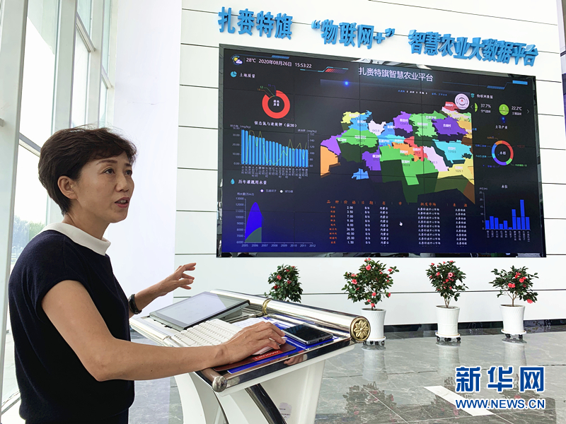 扎賚特旗現代農業(yè)示范園區管理委員會(huì )主任許慧敏,在展示產(chǎn)業(yè)園里的“物聯(lián)網(wǎng)+”智慧農業(yè)大數據平臺。記者王靖 攝